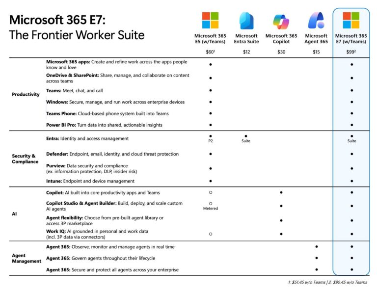Microsoft 365 E7 brings together several existing Microsoft technologies alongside new AI capabilities. The suite includes: